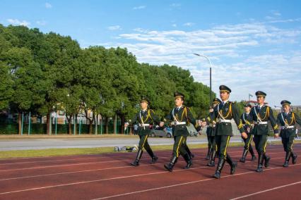 七时整,校国旗护卫队迈着整齐的步伐,缓缓走到升旗台前。国歌响起,在响彻校园的《义勇军进行曲》声中,五星红旗缓缓升起,全体到场老师和同学行注目礼。