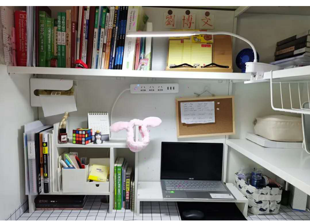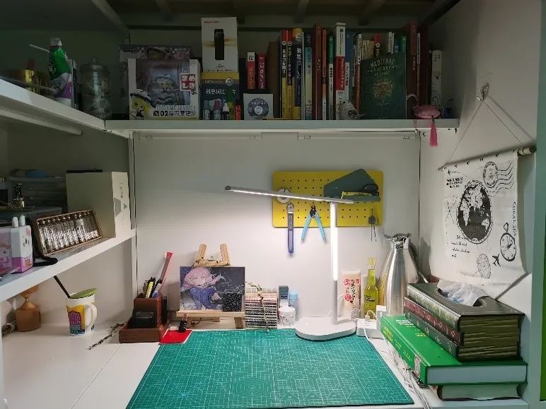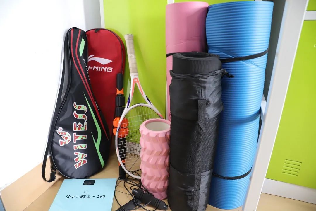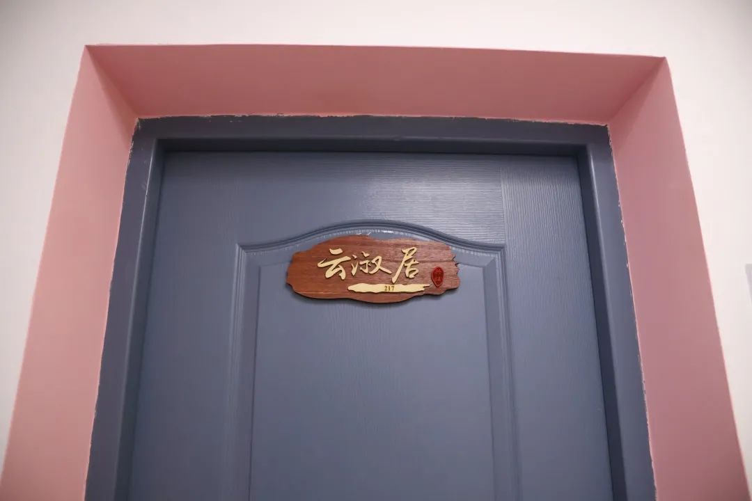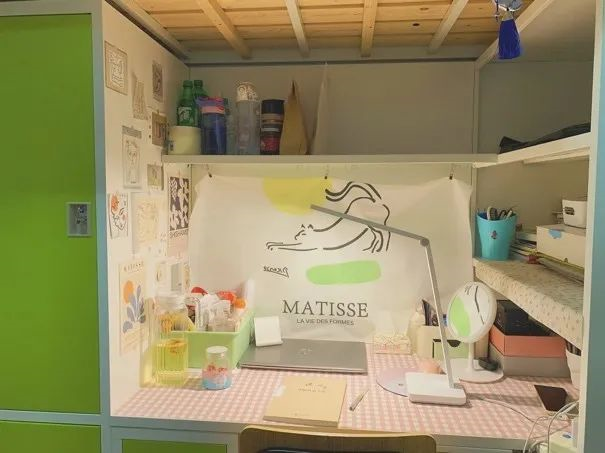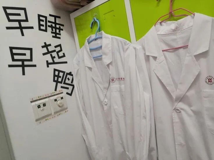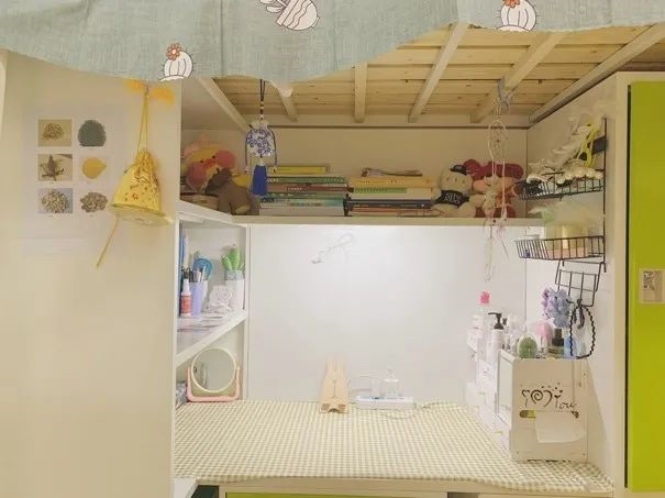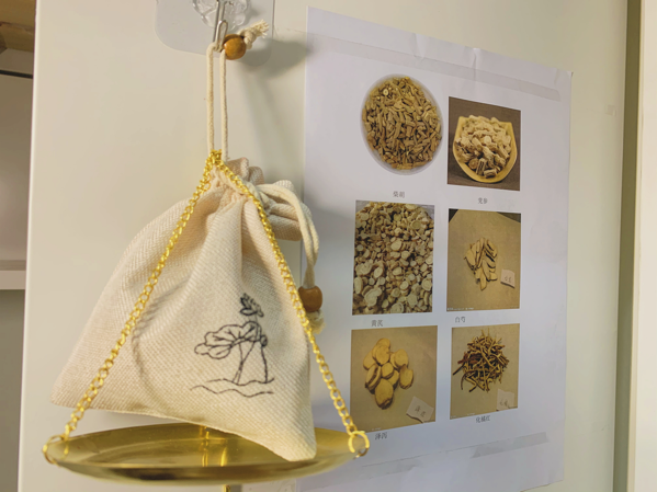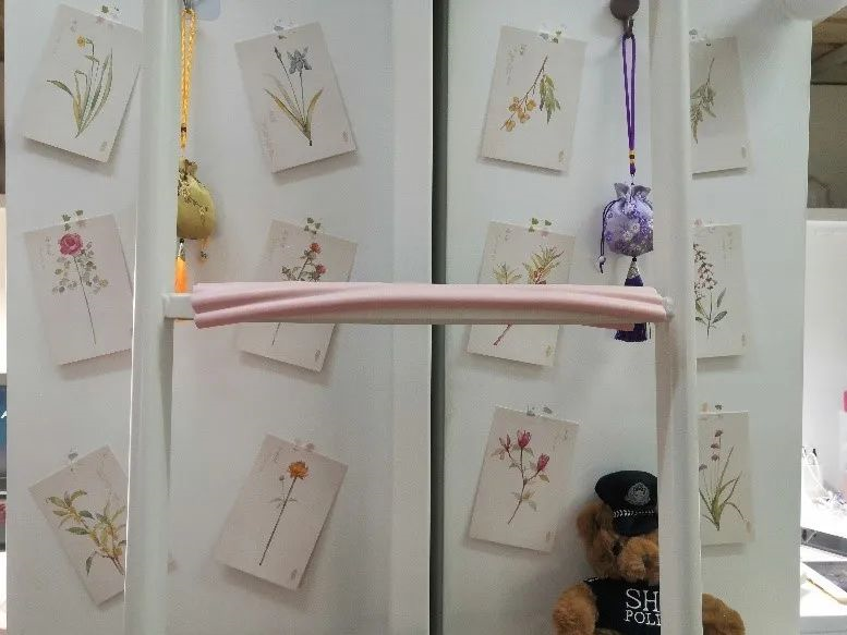 柜子上贴着的中药材,随时方便学习,辨认中药,定期换贴,为将来理论知识真正的运用到实践作准备。学院大礼包的香囊挂在床头防疫助眠提香;摆放旁边的称药方的戥秤可以随时拿起来练习。整个宿舍显得清新,养生而有朝气。