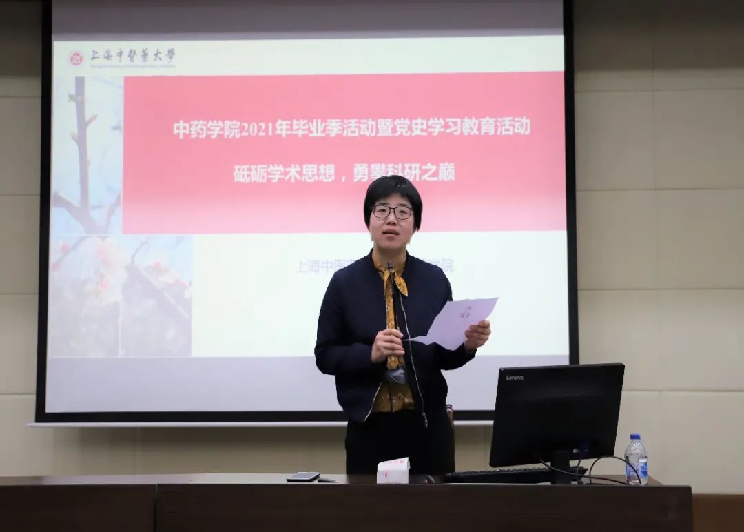 56日,色情动漫 在教学楼6501教室举行色情动漫 2021毕业季主题教育活动暨党史学习教育第三场讲座《砥砺学术思想,勇攀科研之巅》,会议由色情动漫 党委副书记沈漫主持。会前沈书记介绍了本次的主讲人黄容琴教授,黄容琴教授系复旦大学药学院教授,博士生导师,国家优秀青年科学基金获得者。沈书记就黄教授的科研履历、课题研究、学术兼职等向同学们做了详细的介绍,希望广大毕业生在今后的的科研求学中积极进取、锐意创新,不断创新中药研究,用更高质量的科研成果推动中医药的现代化研究。