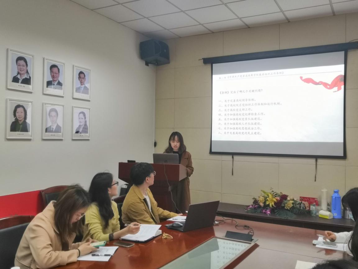 此次组织生活会分党内条例学习和国家总体安全观学习两项议程。第一项议程由三位支部成员分别进行分享交流。首先,二支部刘艺同志从条例目的,条例内容和小结三方面分享了对《中国共产党普通高等学校基层组织工作条例》的学习思考。明确该条例落实质量建党之要求,树立大抓基层的之导向,推动基层党组织全面进步、素质过硬。刘艺通知谈到,作为党员,应当有义务有责任履行条例内容,发挥党员模范带头作用,同时关注他人思想动态,维护党员和群众的正当权利和利益,有针对性地做好思想政治工作。