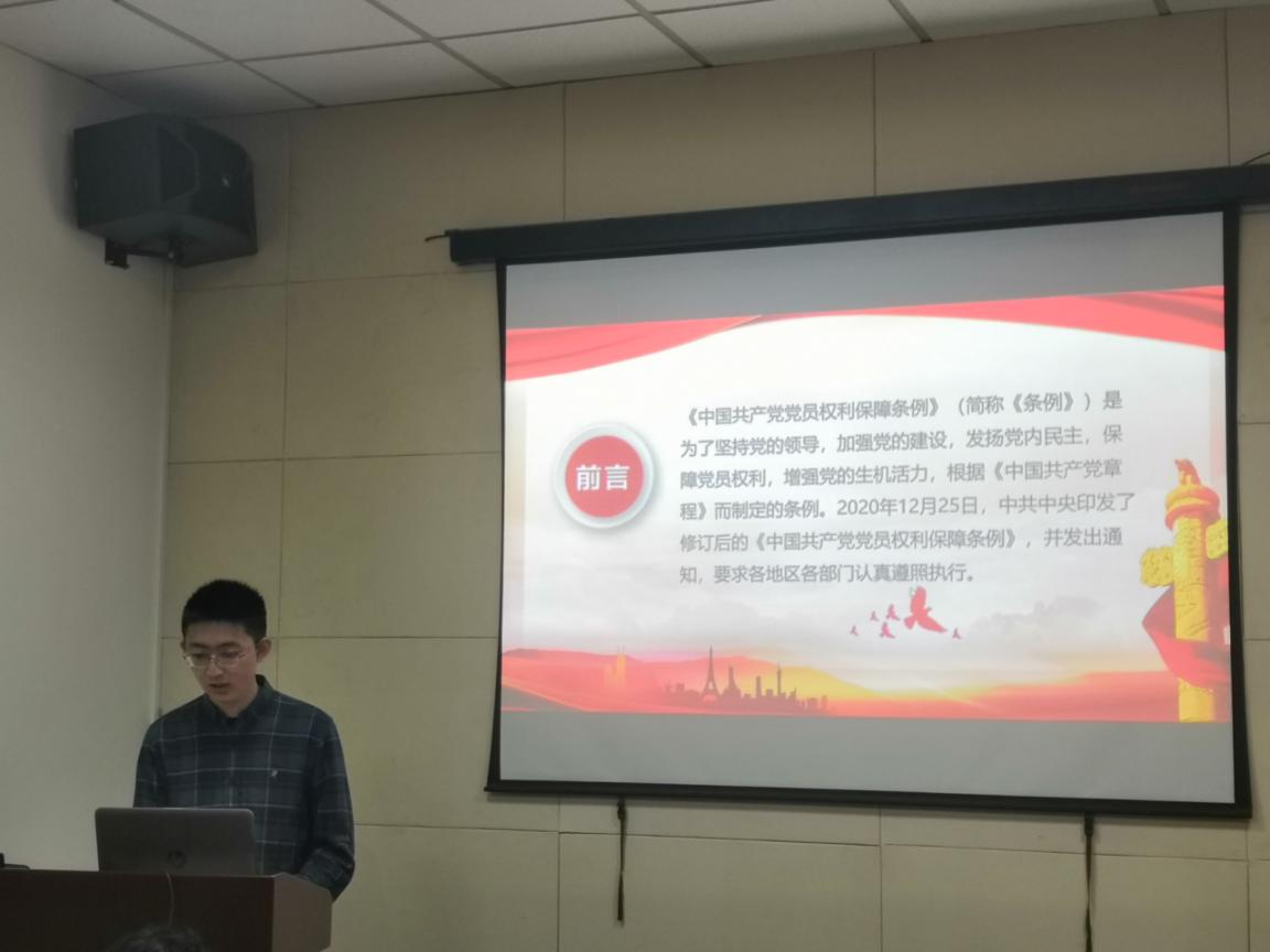 接着张墨聪同志对《中国共产党员权利保障条例》进行了介绍,对比两版条例,阐述新版条例的变化及修改亮点之所在,是强调党员权利与义务相统一。他提到该条例的意义在于充分体现了我们党的领导制度优势,发挥党员主体作用,把全体党员更加紧密地团结在党中央周围,为全面建设社会主义现代化国家、实现中华民族伟大复兴的中国梦而共同奋斗。
