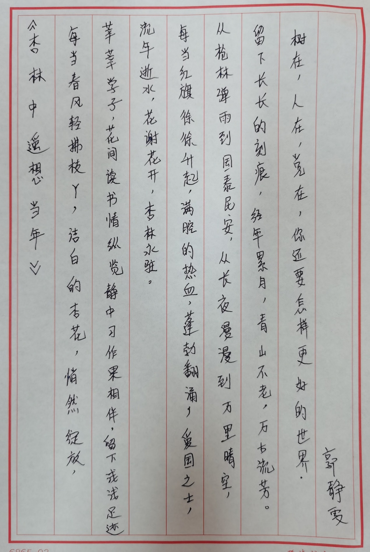 看红旗招展绘辉煌,珍和平繁荣惜今朝。