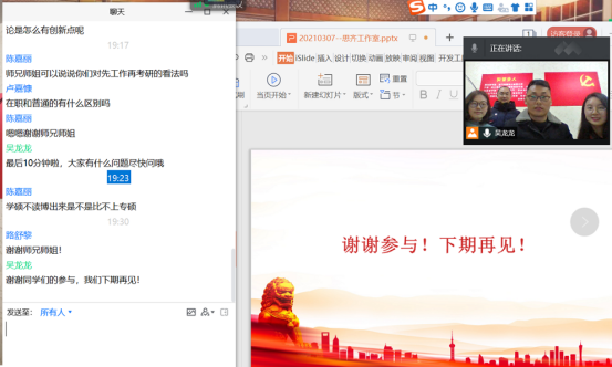 本次答疑解惑主要侧重于考研、保研、直博等升学的硬核问题,各位参与答疑解惑的党员同志都准备了满满的干货,而三月恰逢考研复试准备的关键时期,前来咨询解惑的学生近30人,既有对考研面试的期待,问题中也内涵了他们的焦虑,看到他们咨询的问题,我们更加感受到研究生党员线上线下帮助解答的重要性和内在价值,也进一步明确了思齐工作室作为研究生党建服务的重要品牌在线咨询,服务辐射广大本科生的现实意义。