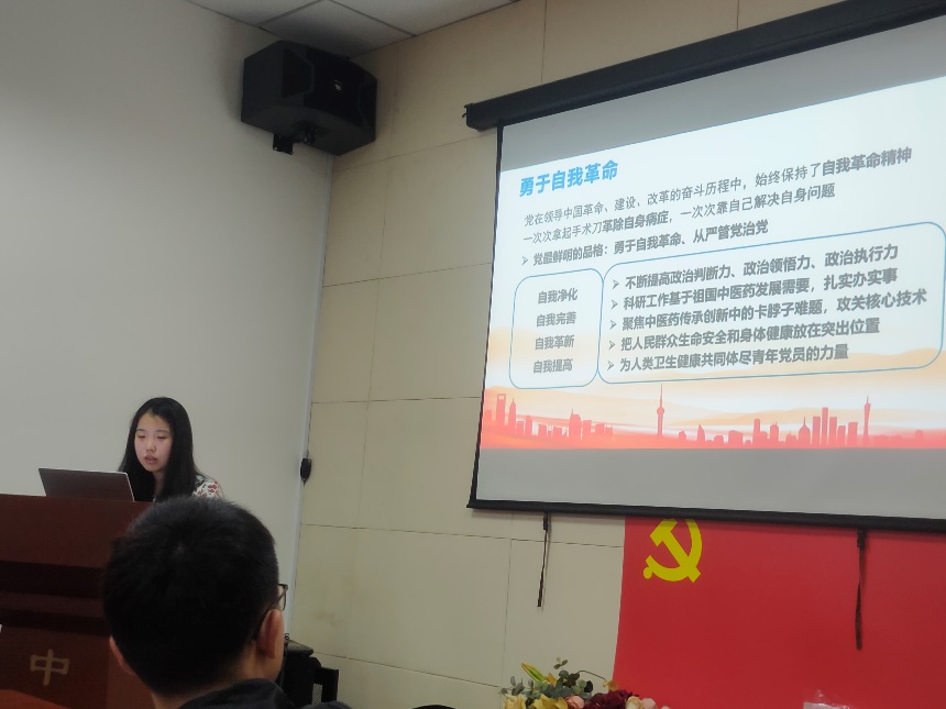 会议开始,支部书记曹佳音“全面从严治党的必要性”展开叙述党情的需要、国情的要求和世情变化,迫切要求中国共产党必须贯彻好党要管党、从严治党的方针,不断提高党的领导水平、执政水平以及应对外部环境考验的能力。接着,支部书记曹家音以时间轴的形式向我们展示了“全面从严治党的历史严格”,用丰富的史实回顾了中国共产党百年奋斗的光辉历程和历史性贡献。
