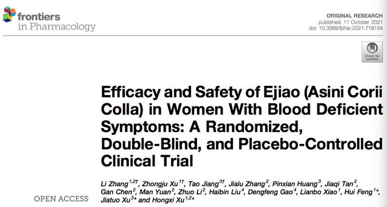 该研究成果Efficacy and safety of Ejiao (Asini Corii Colla) in women with blood deficient symptoms: a randomized, double-blind, and placebo-controlled clinical trial1011在《Frontiers in Pharmacology》杂志上发表。研究主要从病人特征、中医证候、外周血细胞变化及患者的生活质量等方面研究阿胶对中医血虚症状的改善,并对阿胶的临床安全性进行评价。研究结果显示:阿胶能显著改善血虚证患者头晕的症状、减缓红细胞数目及红细胞压积的下降,同时提高白细胞及中性粒细胞数目,从而提高血虚患者的生活质量。安全性评价显示,在血虚患者中连续服用阿胶8周未见明显不良反应及上火现象。本研究为阿胶的临床应用提供了科学依据,为传统中药材的研究及推广奠定了理论基础。