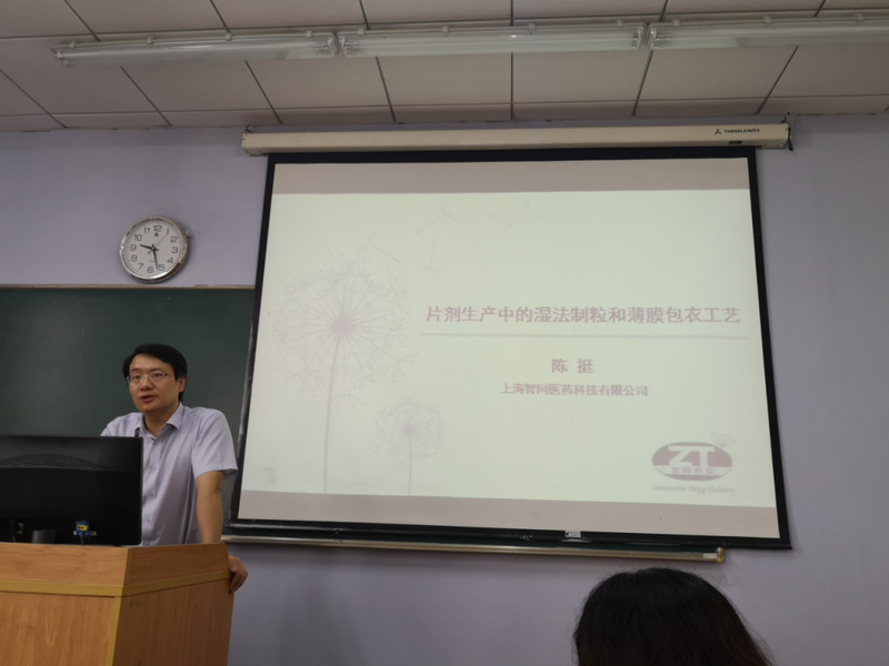 期间还邀请到上海智同医药科技有限公司创始人陈挺为同学开展了关于《片剂生产中的湿法制粒和薄膜包衣工艺》的讲座,配合着工业设备制图,他深入浅出地为同学们讲解设备原理构造与实际应用,并用真实事例告诉大家理论知识虽枯燥,但可以指导实际生产,鼓励同学们要认真学习理论知识,并在工作中灵活应用,做到知行合一。