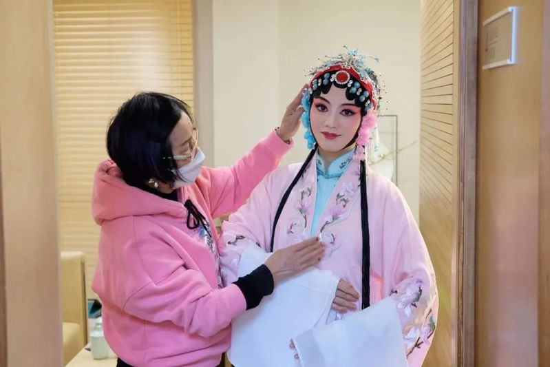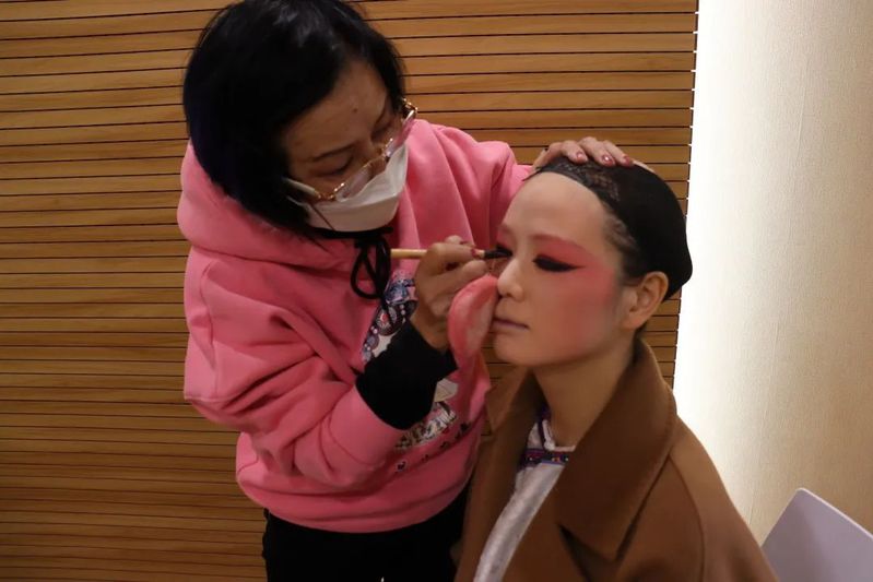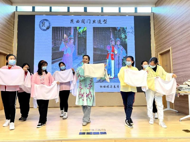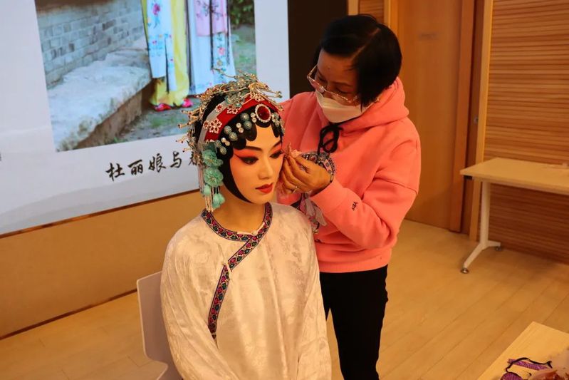 辅导员夏晴老师体验了昆曲的服装和化妆,扮成“杜丽娘”造型,同学们观赏了从准备阶段到最终成品的扮相过程。从上妆“拍彩-油彩-拍红-定妆-画眉眼-元宝嘴-勒头-贴片子-裹水纱-戴头面-耳鬓花”到身段,其过程之繁复也引发了同学们的惊叹。