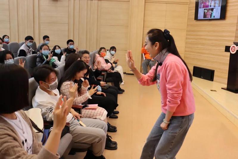 活动中,赵津羽老师示范了艺术宝殿中阳春白雪的兰花指、兰花掌。“昆曲中对动作放在哪个位置,都有尺寸和规定,昆曲讲究而不将就。”正是因为这些规矩造就了昆曲的韵味。赵老师将兰花指和兰花掌演化为昆韵手指操,带现场的老师和同学们一起,让大脑和手指动起来。