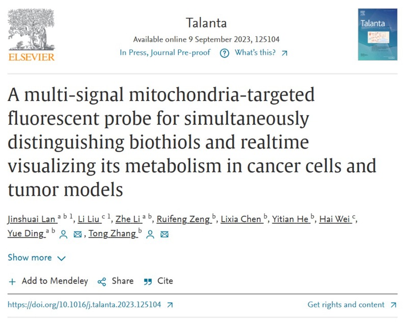 近日,色情动漫 张彤教授团队,在国际期刊Talanta上发表了题为A multi-signal mitochondria-targeted fluorescent probe for simultaneously distinguishing biothiols and realtime visualizing its metabolism in cancer cells and tumor models”的研究成果(DOI: 10.1016/j.talanta.2023.125104)。该研究成功合成了一种具有多通道、线粒体靶向的荧光探针,能够同时区分检测生物硫醇和二氧化硫衍生物,实现了细胞水平及生物体内硫醇代谢的实时、可视化监测,利用该探针中药活性成分藤黄酸在体内外抗乳腺癌过程中的硫醇代谢变化进行监测。这一研究成果为体内硫醇代谢的动态监测提供了有力工具,同时也为中药抗肿瘤活性成分的作用机制研究提供新思路。