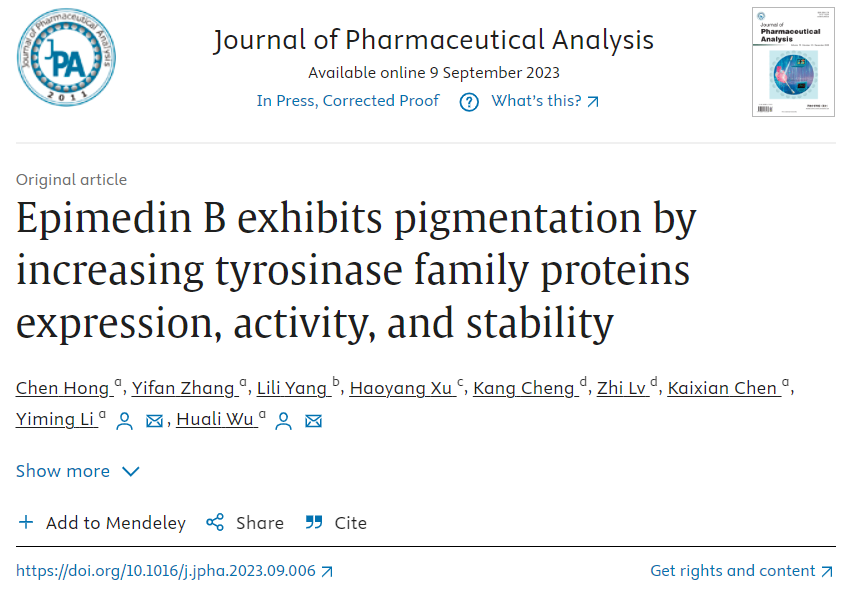 李医明教授团队,在中科院一区期刊Journal of Pharmaceutical Analysis上发表了题为“Epimedin B exhibits pigmentation by increasing tyrosinase family proteins expression, activity, and stability”的研究成果(DOI: 10.1016/j.jpha. 2023.09.006.)。该研究初步阐明了临床治疗白癜风常用中药淫羊藿促进色素合成作用的分子机制和药效物质基础。首先确定了朝藿定B(EB)是淫羊藿提取物中含量高、活性强、毒性低的主要活性成份,并在细胞、组织、斑马鱼、小鼠多层面对EB体内外调控色素方面进行深入系统的研究。这一研究成果从分子水平揭示淫羊藿临床治疗白癜风的药效物质基础,为白癜风的新药开发奠定基础。