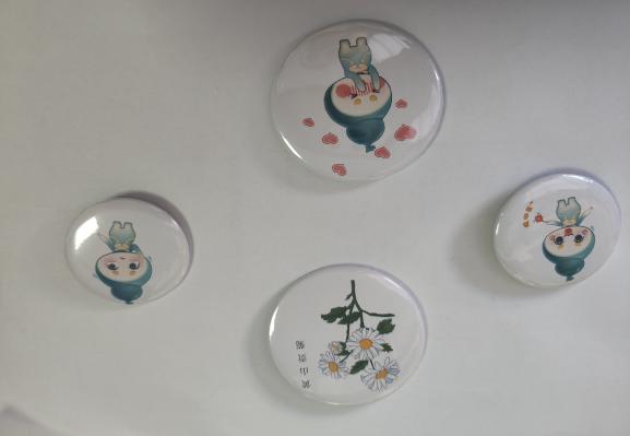 在徽章制作环节,师生踊跃参与制作别具趣味的中药元素的各类徽章。各种中药材和拟人小葫芦图片,按照步骤放入制作盒中,用手使劲下压,一枚可爱的徽章就制作完成。
