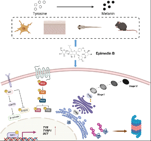 李医明教授团队,在中科院一区期刊Journal of Pharmaceutical Analysis上发表了题为“Epimedin B exhibits pigmentation by increasing tyrosinase family proteins expression, activity, and stability”的研究成果(DOI: 10.1016/j.jpha. 2023.09.006.)。该研究初步阐明了临床治疗白癜风常用中药淫羊藿促进色素合成作用的分子机制和药效物质基础。首先确定了朝藿定B(EB)是淫羊藿提取物中含量高、活性强、毒性低的主要活性成份,并在细胞、组织、斑马鱼、小鼠多层面对EB体内外调控色素方面进行深入系统的研究。这一研究成果从分子水平揭示淫羊藿临床治疗白癜风的药效物质基础,为白癜风的新药开发奠定基础。