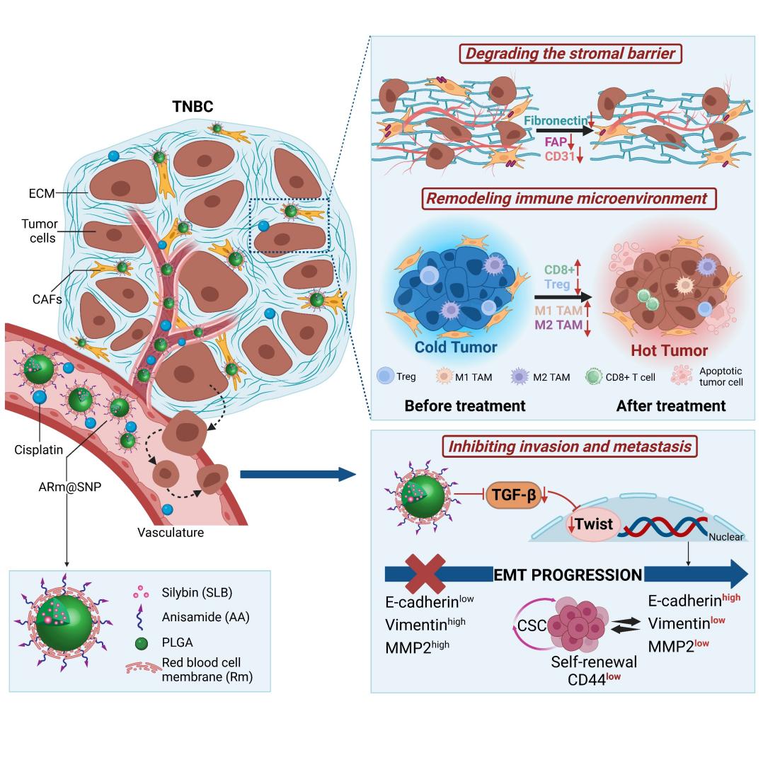在该研究中,将ARm@SNP作为靶向CAFs的“纳米矛”,与Cis联用后,通过破坏CAFs在促进4T1肿瘤发生发展过程中所构成的三重“盾”,进而引起4T1肿瘤生长停滞:抑制血管生成和纤维连接蛋白的表达来瓦解基质屏障;影响TGF-β/Twist/EMT通路,阻碍EMT活化,抑制4T1细胞的侵袭和转移;增加免疫活性细胞的活性和浸润来逆转免疫抑制微环境。综上,基于CAFs靶向功能,ARm@SNP在体外改善了4T1细胞对Cis的耐药性,在体内提高了Cis4T1荷瘤小鼠的治疗效果的同时,重塑了肿瘤微环境,抑制了4T1肿瘤进一步侵袭转移,为三阴性乳腺癌的治疗提供了新的思路。