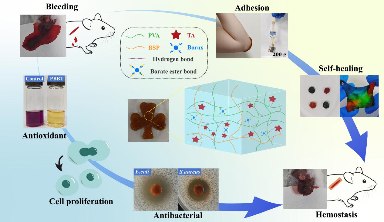 白及多糖(Bletilla striata polysaccharideBSP)是中国传统止血敛疮药白及的主要活性成分,在生物医学领域具有广阔的应用前景。沈岚研究团队以天然多糖BSP为主要网络骨架,动态的聚乙烯醇-硼砂化学网络为另一基质体系,以单宁酸作为理化交联中心整合网络,通过简单的一锅法合成了新型双动态交联水凝胶。BSP在通过多糖结构特性担任网络骨架的同时,凭借自身良好的药理活性和生物相容性赋予了水凝胶材料体内外止血性能和安全性。新材料中动态共价硼酸酯键和可逆非共价氢键的协同作用,以及四种组分之间的合理组合使得新型水凝胶展现出增强的机械性能、组织粘附性和快速自愈性等材料特性,以及包括抑菌、抗氧化和快速止血在内的良好药效性能。作为一种出色的止血粘合剂,该新型水凝胶材料有望为解决未来急性出血、伤口愈合和其他生物医学应用问题提供一种新的解决方案。
