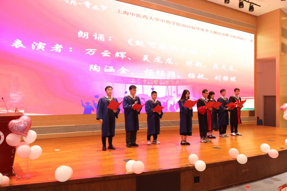 2020中药学研究生万云辉、吴龙龙等8同学带来朗诵《致可敬的中药人》用真挚的情感和深情的朗诵,向陶建生、赵志礼、徐宏喜、李医明、沈岚、张彤、冯年平、李后开8导师表达了崇高的敬意和无尽的感激。