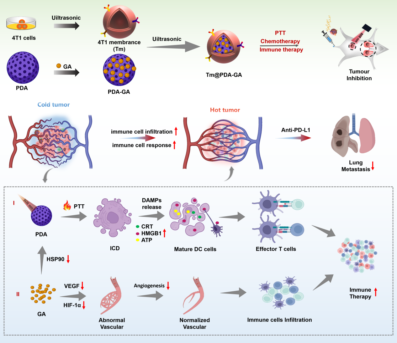 近年来,免疫治疗因其低副作用以及强效抗肿瘤作用备受关注。然而,T细胞浸润不足以及效应T细胞分化效率低导致的免疫治疗响应率低,仍是肿瘤免疫治疗临床应用中的巨大挑战。针对该难题,本研究以具有诱导血管正常化以及促凋亡作用的藤黄酸(gambogic acidGA)为模型药物,成功构建了多功能载药仿生纳米制剂Tm@PDA-GA NPs,实现了增强免疫细胞激活以及增加肿瘤免疫浸润,联合免疫检查点抑制剂anti PD-L1,增强了肿瘤免疫治疗效应,有效抑制乳腺癌生长及肺转移