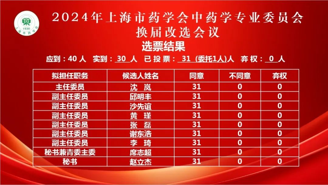 到场的委员候选人一一进行自我介绍,并举手表决新一届专委会组成。至此,上海市药学会第八届中药学专委会成立,委员共计40名。在上海市药学会第七届中药学专委会成立的基础上,经委员无记名等额投票、上海市药学会办公室工作人员当场计票,沈岚当选为上海市药学会第八届中药学专委会主任委员,邱明丰、沙先谊、黄瑾、张磊、谢东浩、李琦当选为副主任委员,席志超当选为青委主委,席志超和赵立杰当选为秘书。徐宏喜教授作为专委会的名誉主委,黄宝康教授、史秀峰教授作为荣誉委员,继续支持学会的工作。
