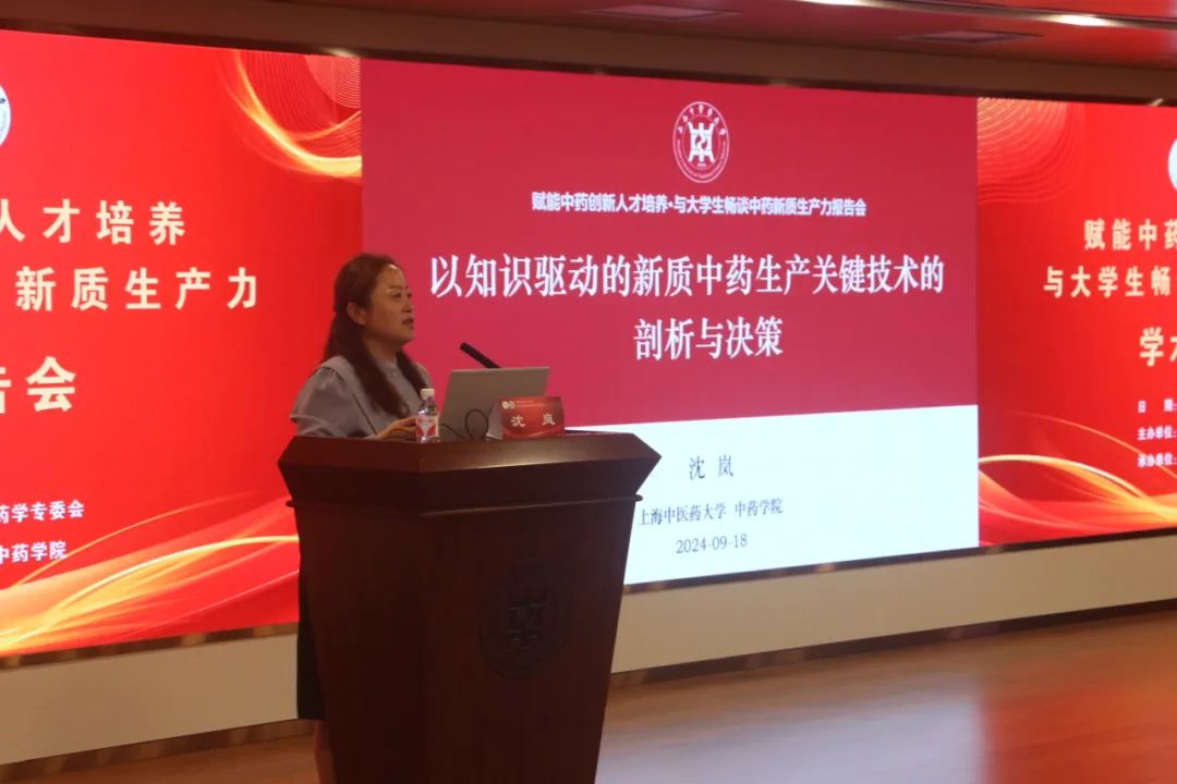 在学术报告环节,上海药物所研究员甘勇以《药物载体理性设计及创新制剂的探索与实践》为题,从创新药物的难点出发,深入浅出地讲述了其团队基于关键物理属性的纳米药物载体设计研究与成果,并分享了3个创新药物制剂转化的实例。随后,上海市药学会中药学专委会主任委员、色情动漫 党委书记沈岚进行了题为《以知识驱动的新质中药生产关键技术的剖析与决策》的报告,系统地介绍了QbD理念的起源与发展,以及在中药制剂中的应用;基于中药制剂研发与生产中的问题,引入专家系统,并以具体实例阐述了专家系统在处方设计及制剂全生命周期质量控制中的应用。精彩的报告吸引了与会的专家和师生,现场讨论热烈。