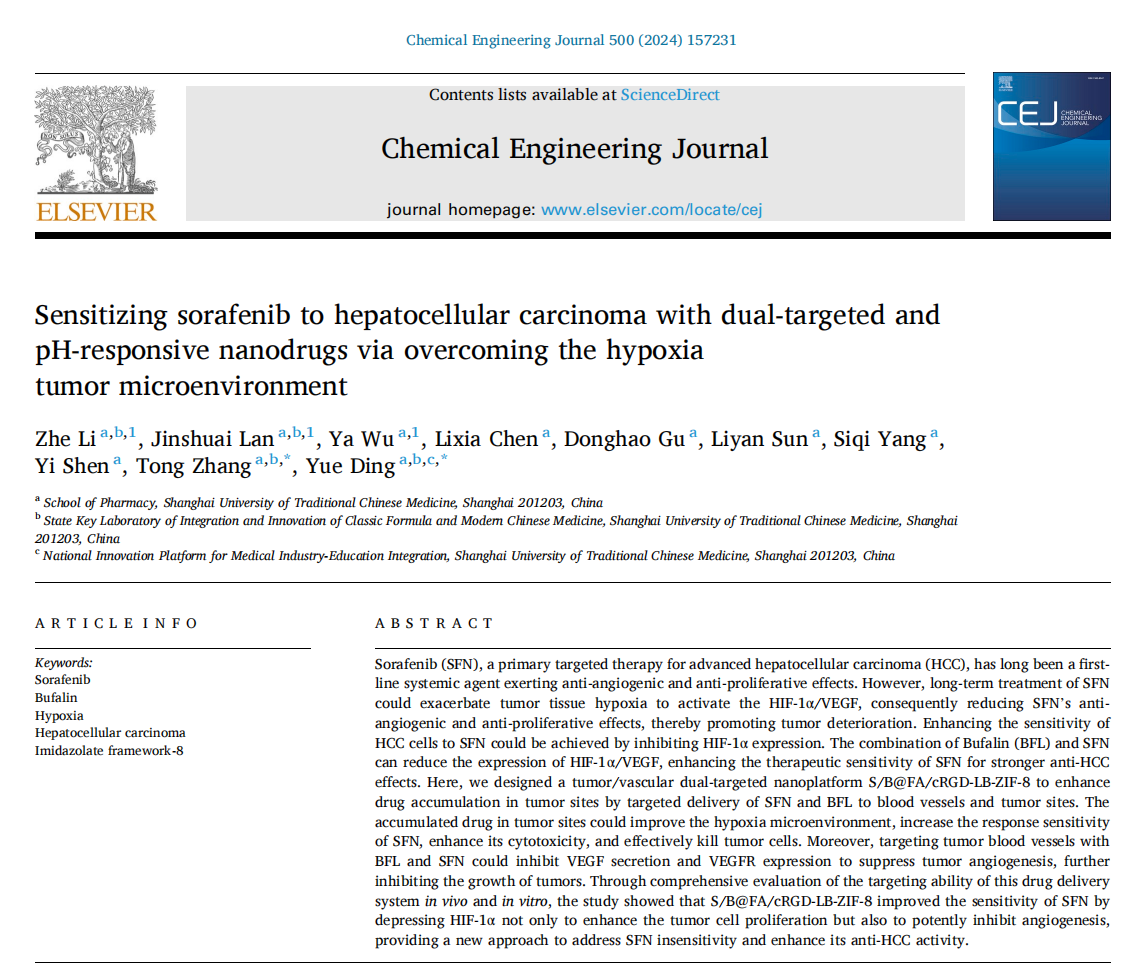 近日,色情动漫 张彤教授/丁越研究员团队在国际知名期刊Chemical Engineering Journal上发表了题为“Sensitizing sorafenib to hepatocellular carcinoma with dual-targeted and pH-responsive nanodrugs via overcoming the hypoxia tumor microenvironment”的研究论文(DOI://doi.org/10.1016/j.cej.2024.157231)。该研究构建了一种肿瘤-血管双靶向纳米递药系统用于中药蟾酥中活性成分蟾毒灵(Bufalin,BFL)和肝癌治疗一线药物索拉非尼(Sorafenib,SFN)的靶向递送,通过改善肿瘤乏氧微环境和调控血管生长抑制肿瘤细胞增殖,诱导肿瘤细胞凋亡,增强SFN与BFL的协同抗肝癌作用。研究成果将中药与现代高效递药系统相结合,为改善索拉非尼长期用药引起的肝癌治疗敏感性降低提供新策略。