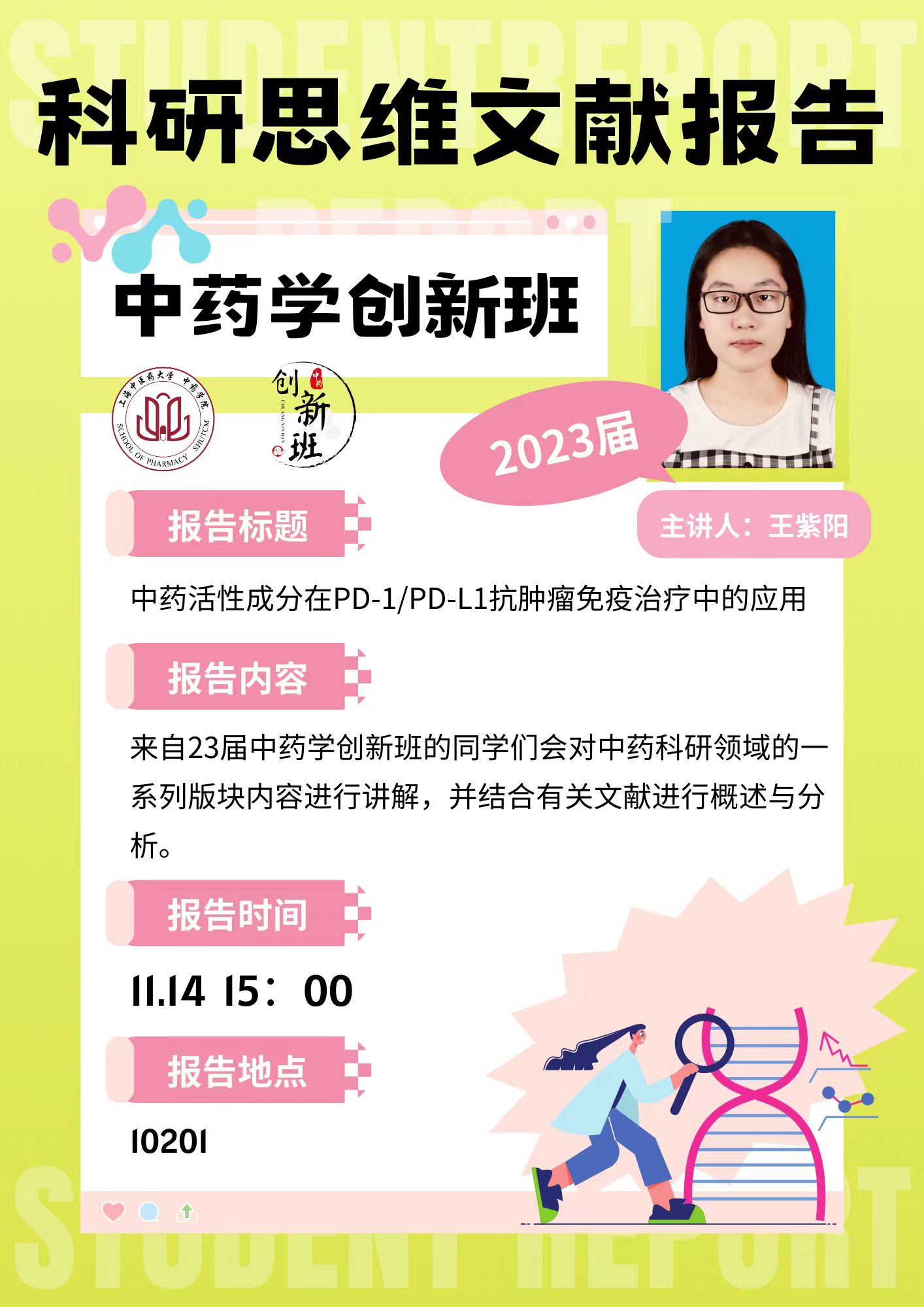 23级中药学创新班课程由郑昌武副院长和洪超老师共同组织和负责。课程为每位学生讲者制作海报,邀请全校老师和学生观摩,并由23级创新班的同学们轮流主持,邀请色情动漫 青年班主任老师及两位创新班同学参与指导和评分。