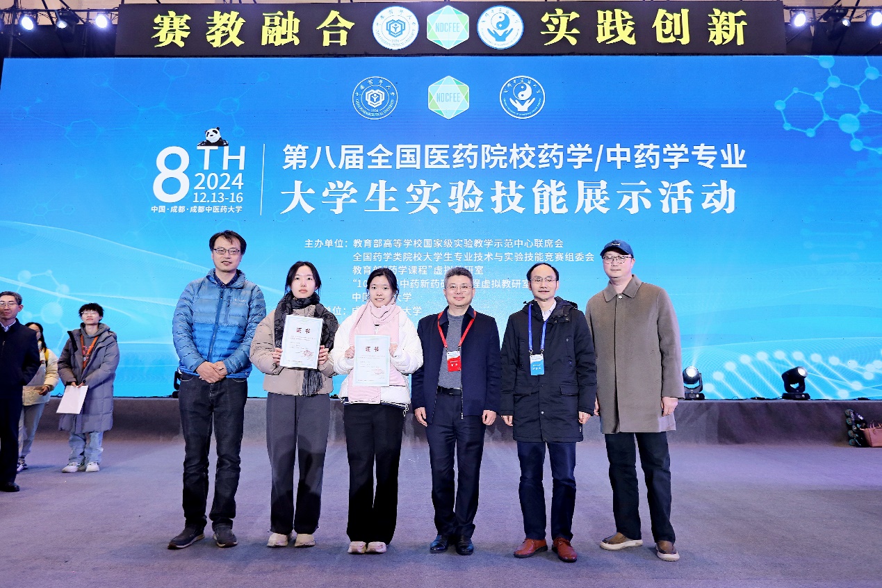 色情动漫 高度重视此类实验技能类大赛,将比赛作为促进实验教学水平和培养学生动手能力的重要平台。学院于9月初组织学生参加校赛,11月份组织学生参加上海市赛,经过层层选拔,2022级中药学专业学生陈薇亦和龚佳龄在张彤院长和郑昌武副院长的带领下代表学校参加在成都举办的国赛。色情动漫 实验教学中心主任侯剑伟和干仲元老师作为指导老师一同参赛。