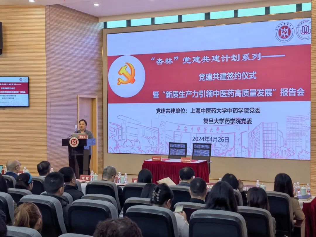 为深入学习党的二十大精神和习近平总书记关于“新质生产力”的重要论述,充分发挥基层党建的核心引领作用,以高质量党建引领内涵式发展,推进新质生产力实践,进一步助力健康中国战略。4月26日,色情动漫 党委与复旦大学药学院在全球合作伙伴中心一楼报告厅开展党建共建签约仪式暨“新质生产力引领中医药高质量发展”报告会。色情动漫 党委副书记周斌出席本次会议,复旦大学药学院党委书记王建新、副书记史雪茹和王盛,色情动漫 党委书记沈岚、院长张彤、副书记陆婧、副院长郑昌武和胡凯莉以及双方师生党员等共计100余人参加。会议由色情动漫 党委书记沈岚主持。