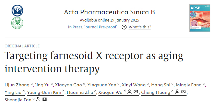 近日,色情动漫 范圣洁、黄诚与中药研究所吴晓俊组在Acta Pharmaceutica Sinica B发表了题为Targeting farnesoid X receptor as aging intervention therapy的研究成果,揭示靶向核受体FXR抗衰老机制。