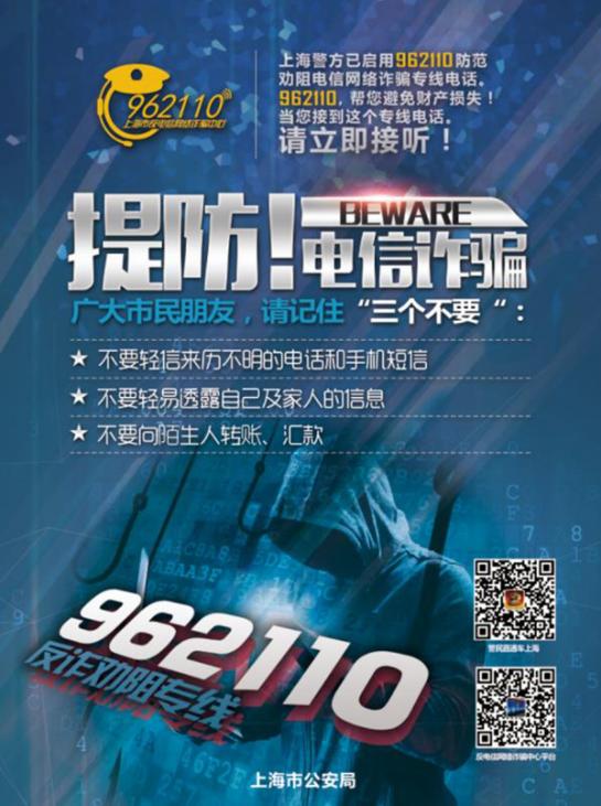 特别提示:962110是上海市反电信网络诈骗中心防范劝阻电话和短信统一专号,凡是来电显示为962110,请务必接听!