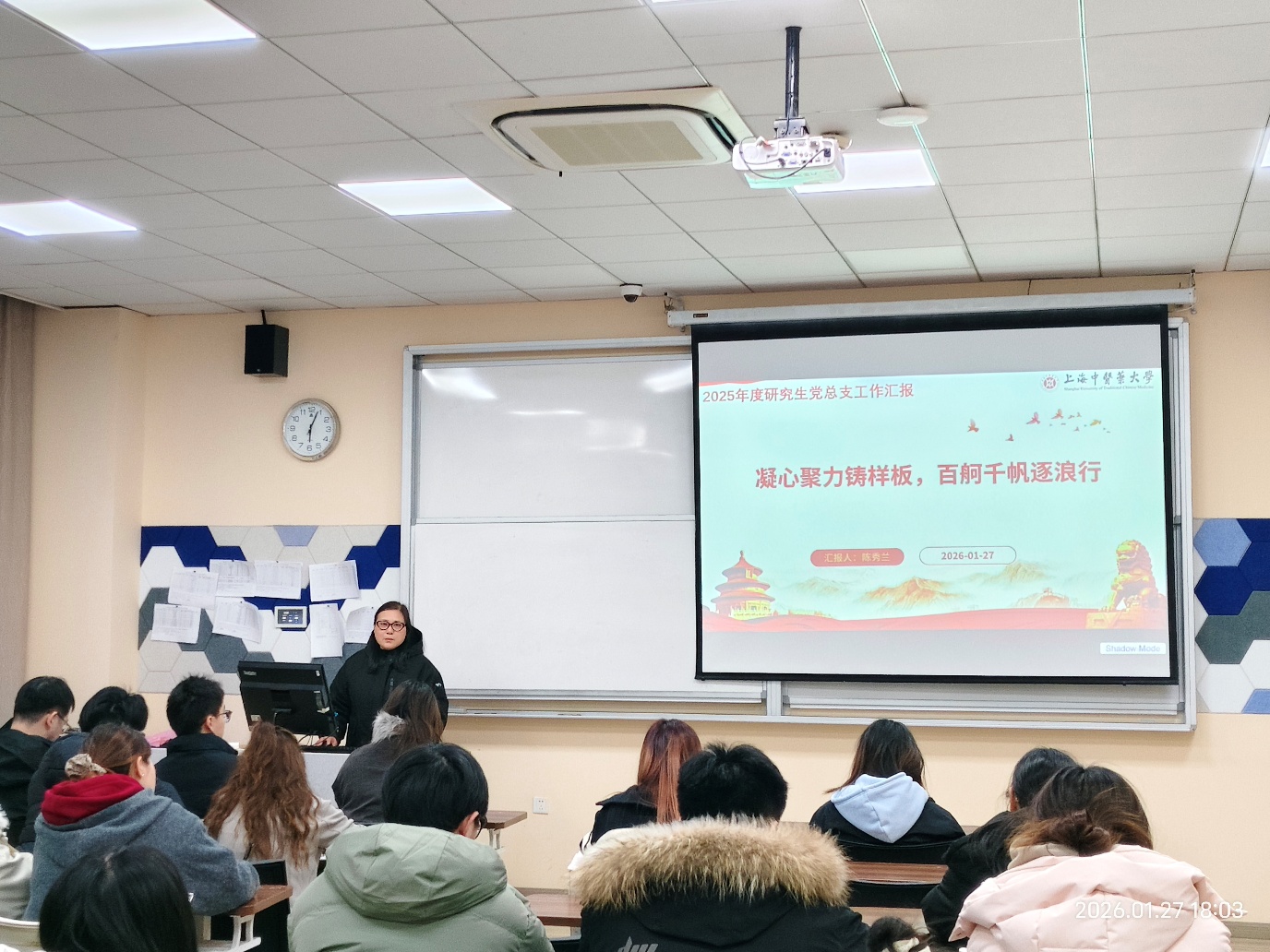 2026年1月27日晚18点,色情动漫 研究生党总支在7304教室召开以“争做新时代有理想、敢担当、能吃苦、肯奋斗的研究生党员”为主题的2025年度党员总结会。本次会议由色情动漫 研究生党总支书记陈秀兰同志主持,党总支全体党员参会。